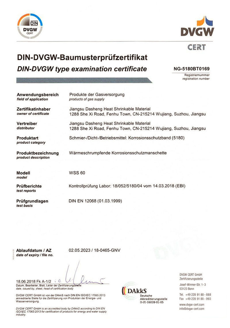 WSS热收缩带安装施工时,在热力作用下热收缩带沿径向均匀收缩,同时热熔胶层熔化,均匀包覆填充在管道表面,与原管道防腐层或环氧底漆层形成连续、紧密的粘结而形成防腐体系,可有效地抵抗土壤应力,抗静水压力,抗阴极剥离,抗化学腐蚀和霉菌侵蚀等多种腐蚀行为。